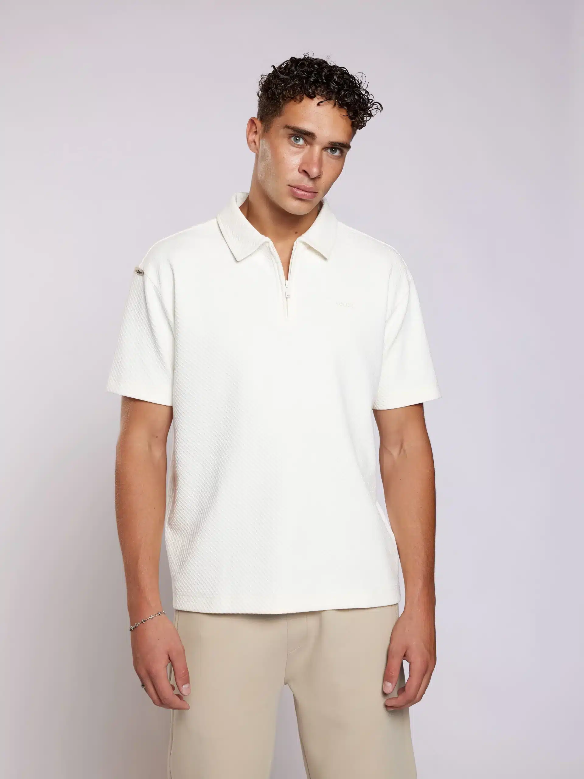Prachtige polo in een gebroken witte kleur van het merk Aeden. De Cody Polo combineert katoen, polyester en elastan voor een comfortabele regularfit pasvorm met een vleugje stretch. De polo met korte mouwen en een moderne ritssluiting op de borst, is een stijlvolle update van een tijdloos basisstuk. Afgewerkt met een strakke HD-print op de borst, combineert het casual gemak met verfijnde details.