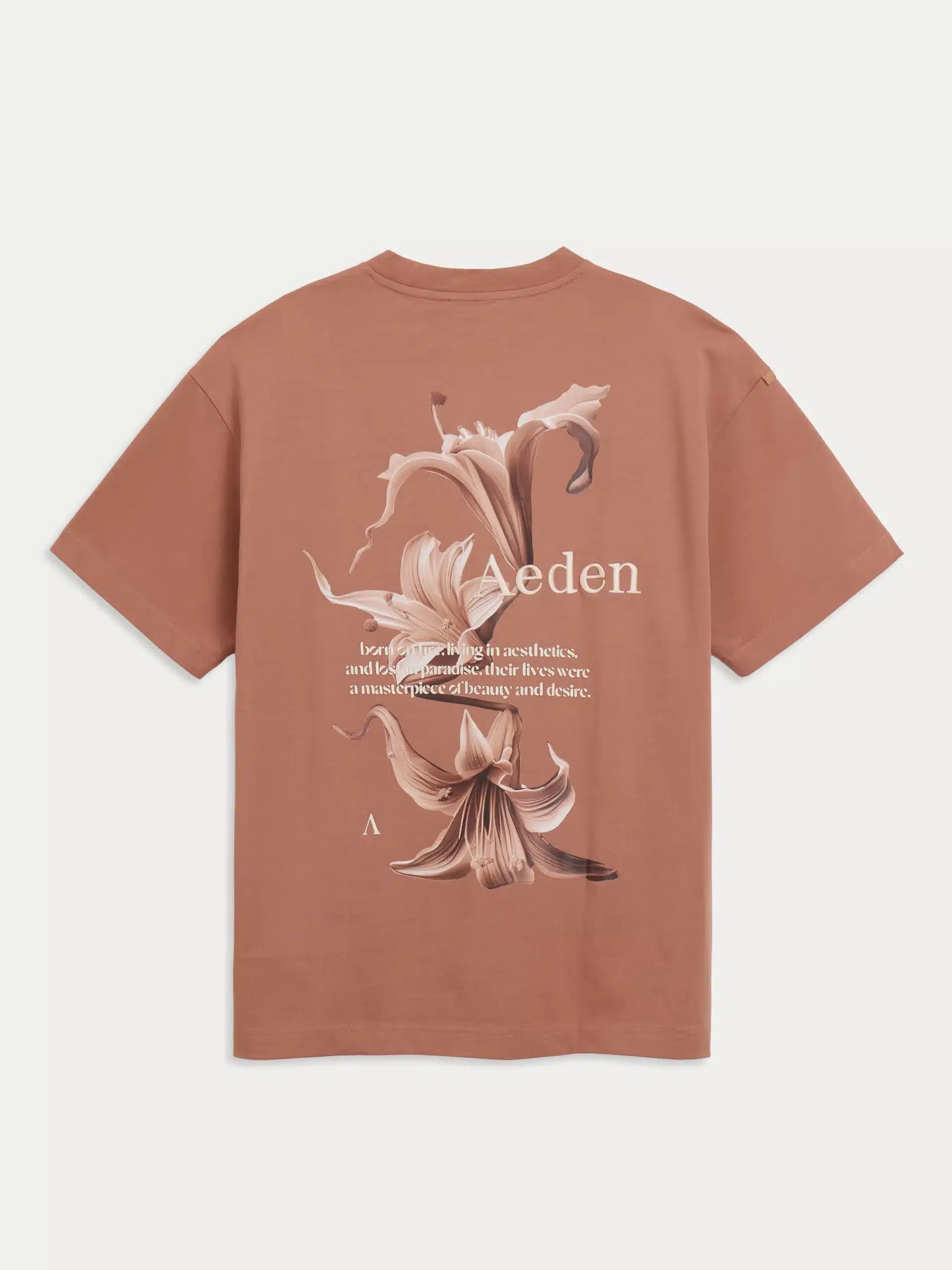 Prachtig t-shirt in een mokka kleur van het merk Aeden. Gemaakt van 100% biologisch katoen met een geborstelde afwerking voor een zachtere touch en een soepelere pasvorm. De Ezio Tee heeft een oversized pasvorm en een grote fotoprint op de rug. Op de borst vind je ons kenmerkende Aeden-logo geborduurd in ton-sur-ton stiksel.