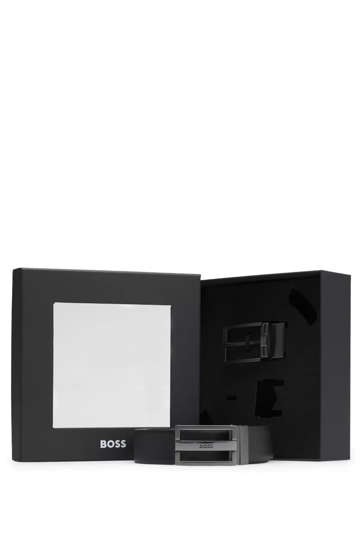 Prachtige riem van het merk Boss. Het gaat hier om een cadeau set die bestaat uit een band en twee gespen. De 3,5 cm brede band is gemaakt van luxueus Italiaans leer en is aan twee zijde te dragen. Een zijde is zwart en heeft een fijn structuur en de andere zijde is bruin en glad. De twee gespen zijn beide gemaakt van metaal, voorzien van het merknaam en zijn makkelijk verwisselbaar. De lengte van de band is eenvoudig op maat te maken. Neem voor instructies contact op met de winkel.
