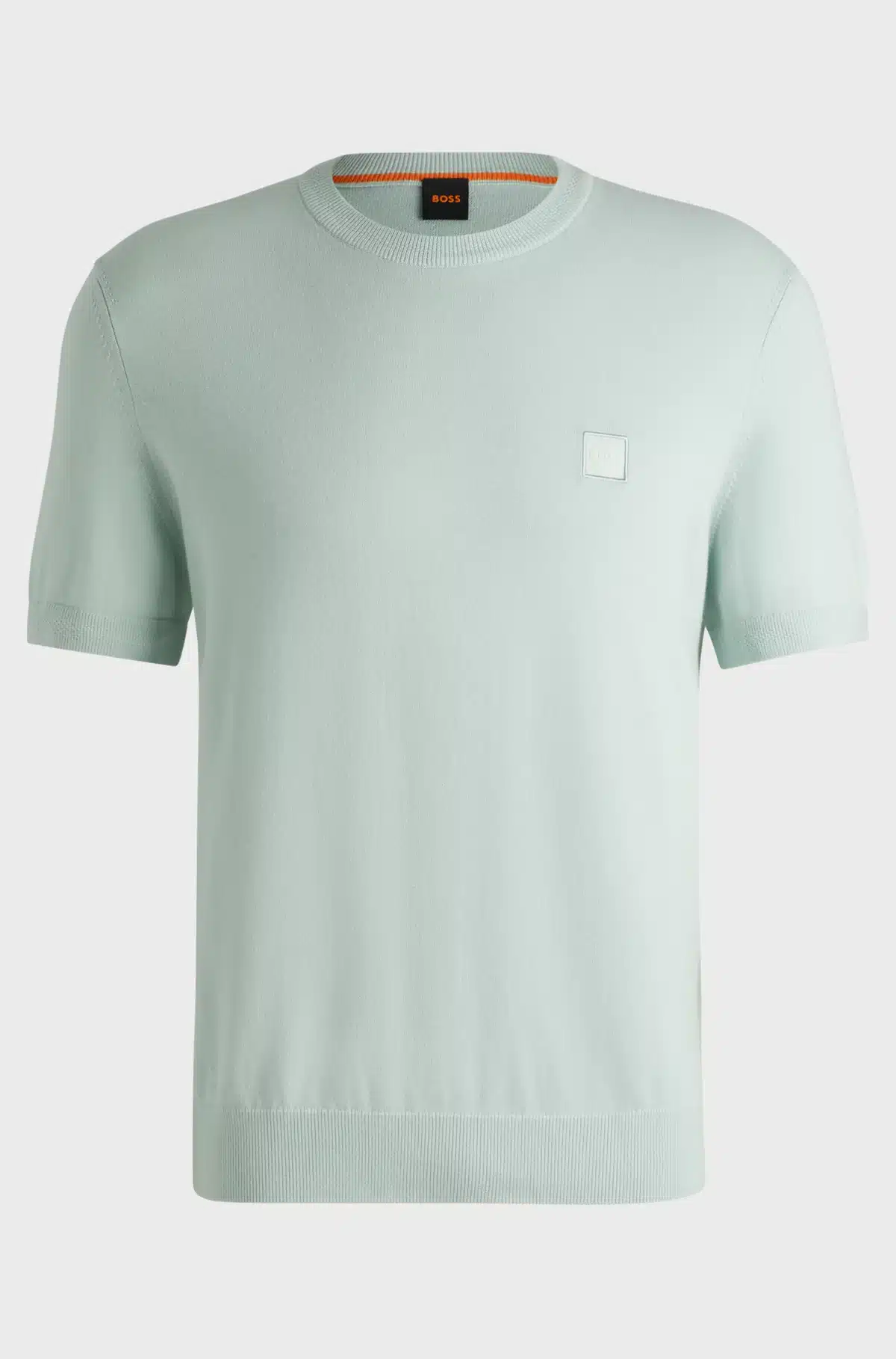 Mooi T-shirt in een licht blauwe kleur van het merk Boss. Het shirt is gebreid van lichtgewicht katoen met luxe kasjmier en heeft een comfortabele, relaxte pasvorm voor een nonchalante stijl. Het shirt heeft een ronde hals en een verfijnde ton-sur-ton satijnen logopatch
