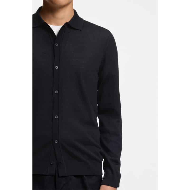 Mooie trui in een zwarte kleur van het merk Boss. De trui is gemaakt van 100% wol, hierdoor voelt deze zacht aan en houd het goed de warmte vast. De trui is uitgevoerd met een polo kraag, een knopen sluiting over de hele lengte en het heeft een regularfit pasvorm.