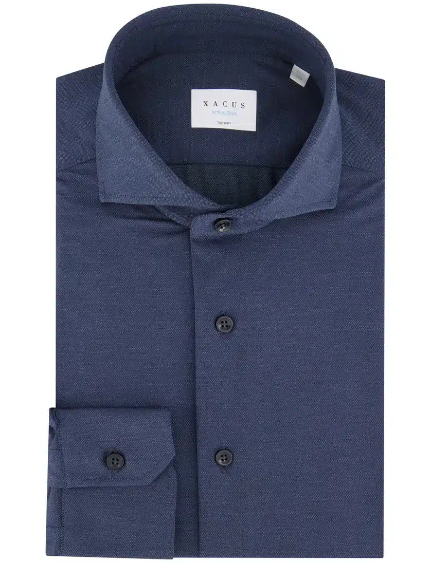 Prachtig overhemd in een donker blauwe melange kleur van het merk Xacus. Het overhemd is gemaakt van polyester in combinatie met polyamide en elastan. Hierdoor heeft het overhemd een fijne stretch en draagt het zeer comfortabel. Het overhemd droogt zeer snel, is strijkvrij en de pasvorm is tailorfit. Dit item is goed te combineren voor een zowel casual als formele gelegenheid.